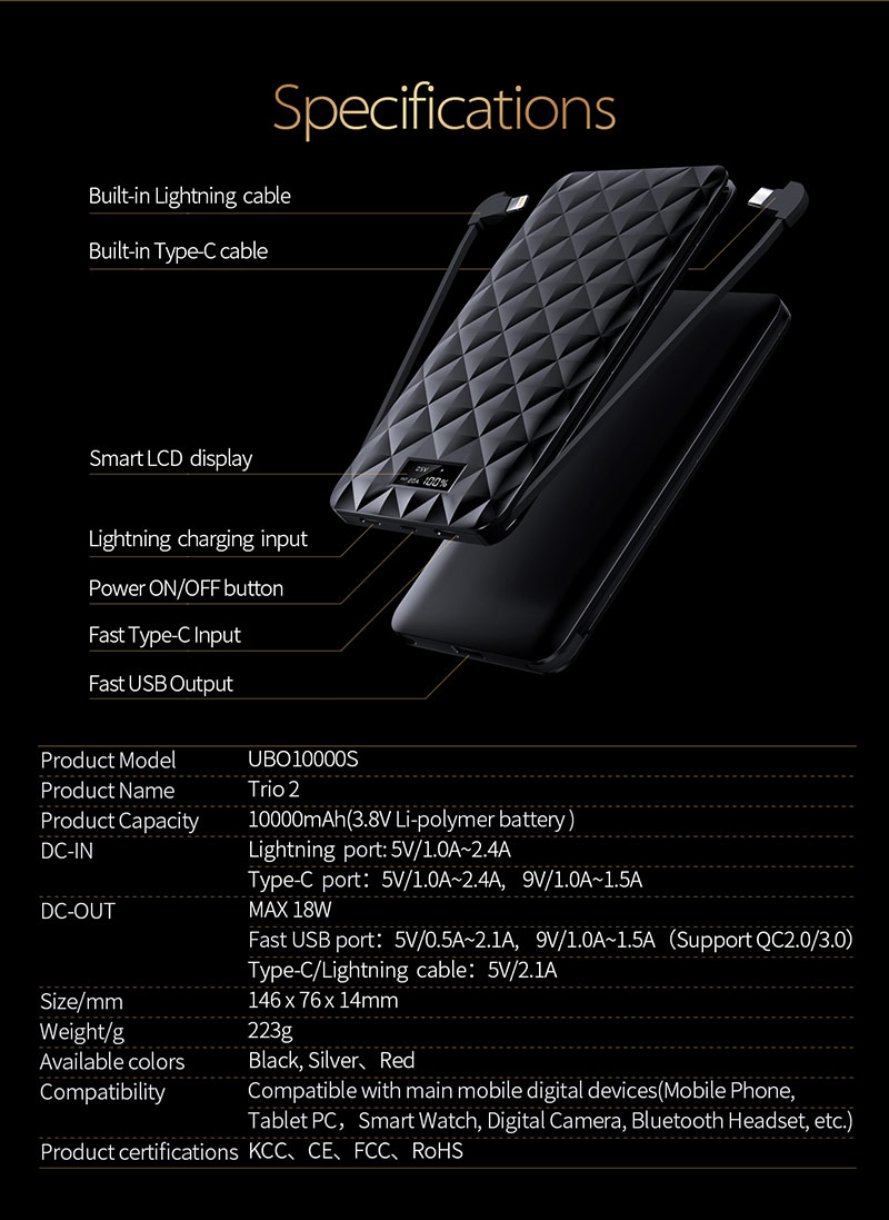 Sạc di động QC tích hợp cáp Lightning, Type-C và màn hình LCD là nguồn năng lượng di động mạnh mẽ và tiện ích. Với khả năng sạc nhanh (Quick Charge), bạn có thể nhanh chóng nạp năng lượng cho thiết bị của mình. Sự tích hợp của cáp Lightning và Type-C giúp đáp ứng đa dạng các loại thiết bị, trong khi màn hình LCD hiển thị chính xác mức pin còn lại, mang lại trải nghiệm sử dụng linh hoạt và thuận tiện. Thiết kế nhỏ gọn và tích hợp các tính năng tiên tiến, sản phẩm này là lựa chọn lý tưởng cho người dùng di động đòi hỏi hiệu suất và đa năng từ một sạc di động.